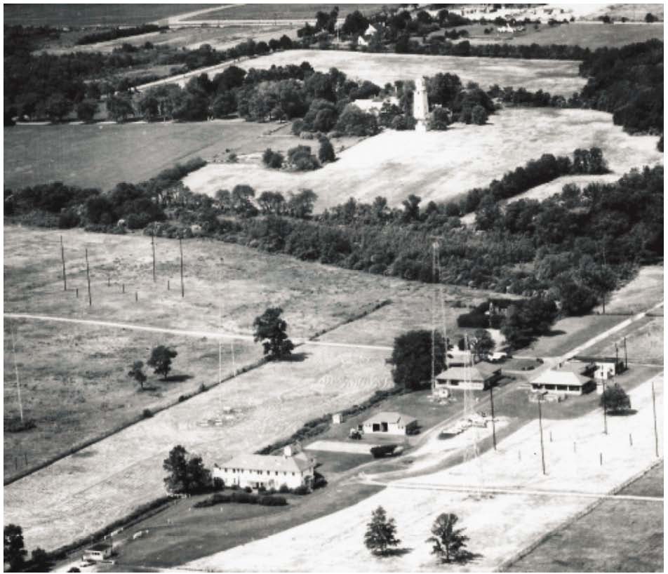 | Deal Test Site, looking southwest from Whalepond Road. Stucile Farm (site of today’s Museum and Library) and its tower are visible at the top of this aerial shot. Judging from the cars in the lot and the absence of satellite dishes, it was probably taken in the mid-1950s. Notice how dry and treeless the site was 60 years ago. |